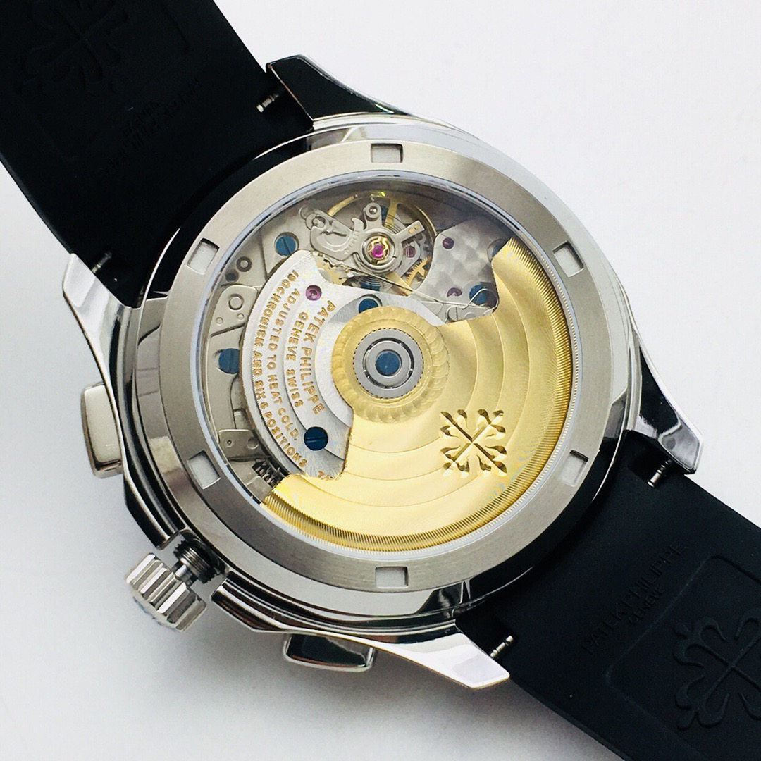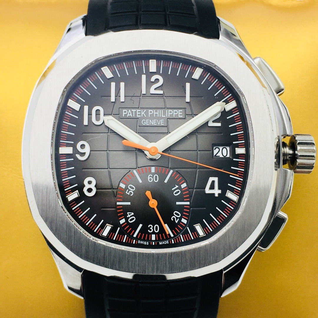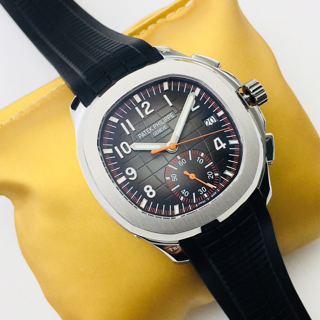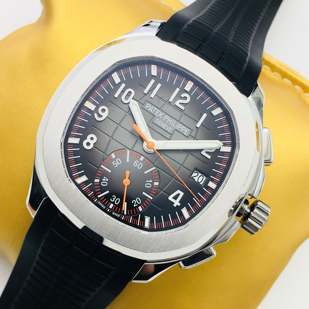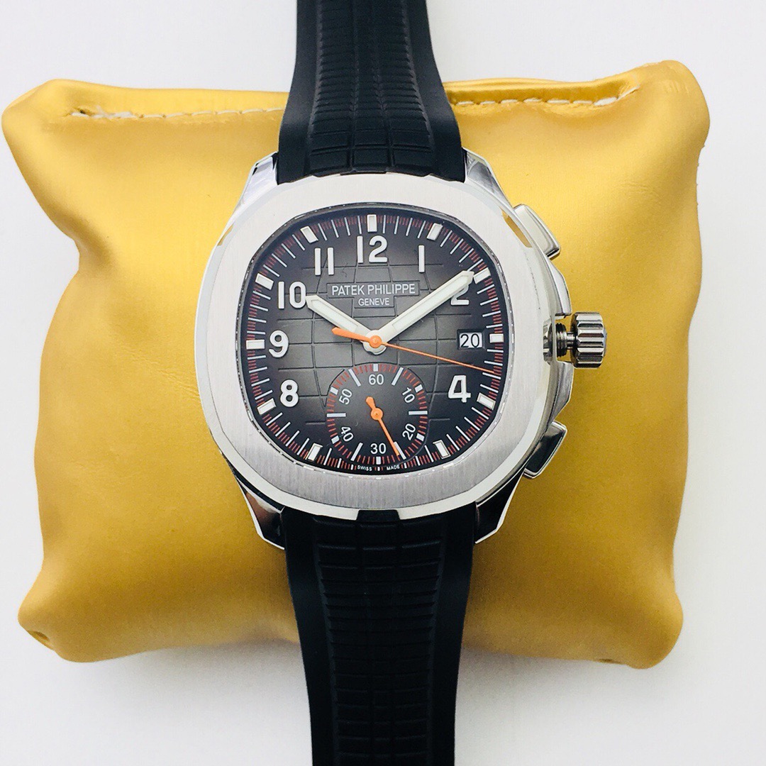 Silver-tone stainless steel case with a black rubber strap. Fixed bezel. Black dial with silver-tone hands and Arabic numeral hour markers. Dial Type: Analog. Date display at the 3 o'clock position. One- 60 minutes subdials. Patek Phillipe Calibre CH 28-520 C automatic movement with a 55-hour power reserve. Scratch resistant sapphire crystal. Screw down crown. Transparent case back. Cushion case shape, case size: 42.2 mm, case thickness: 11.9 mm. Band width: 22 mm. Fold-over clasp. Water resistant at 120 meters / 400 feet. Functions: date, hour, minute, second. Additional Info: comes with interchangeable orange composite strap. Luxury watch style. Watch label: Swiss Made. Patek Philippe Aquanaut Black Dial Automatic Mens Chronograph Watch 5968A-001.